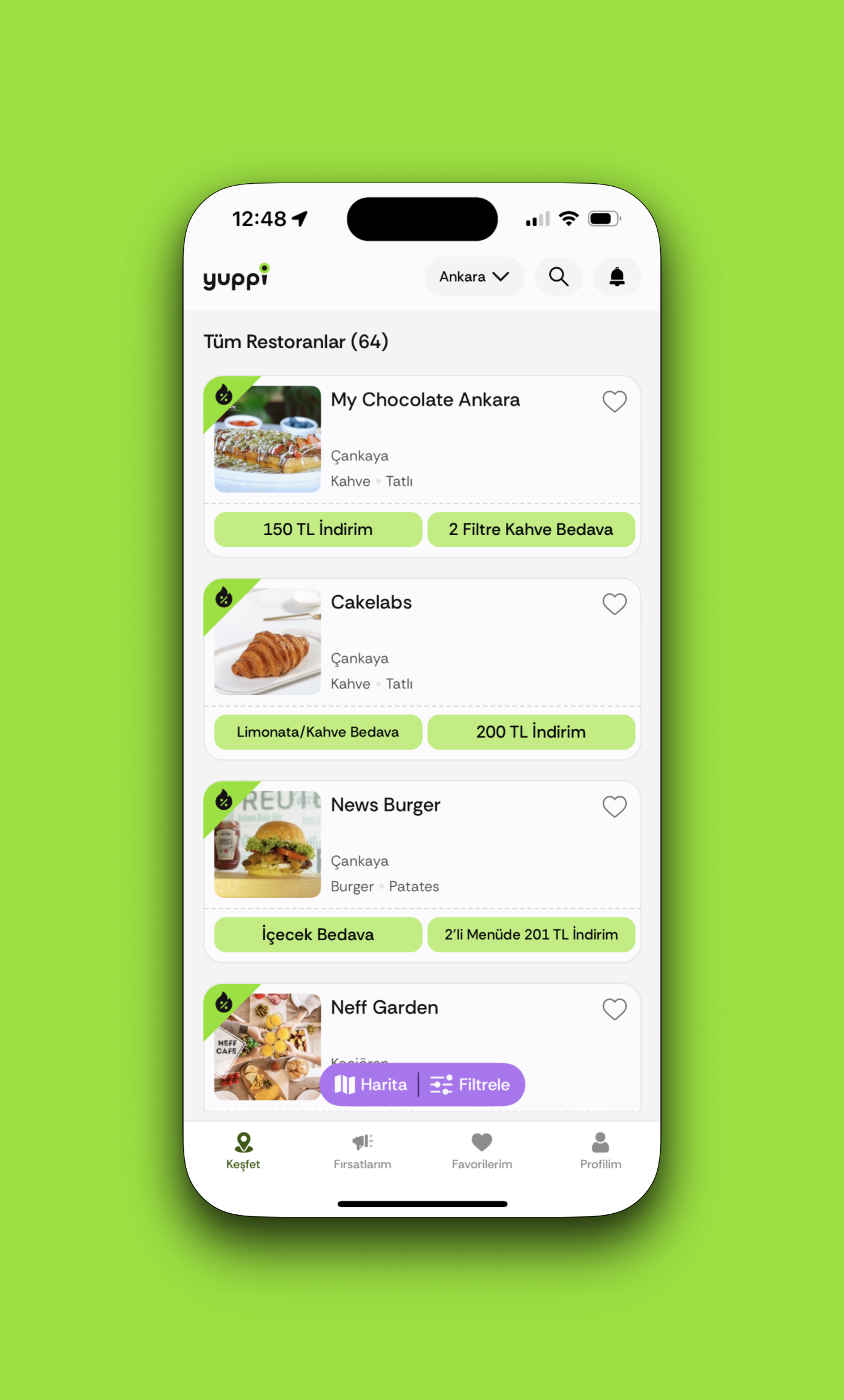 Dining out should feel rewarding, not random. Yuppi was born to blend discovery with automatic perks, giving Turkey’s food lovers a single discover-deal first app that: